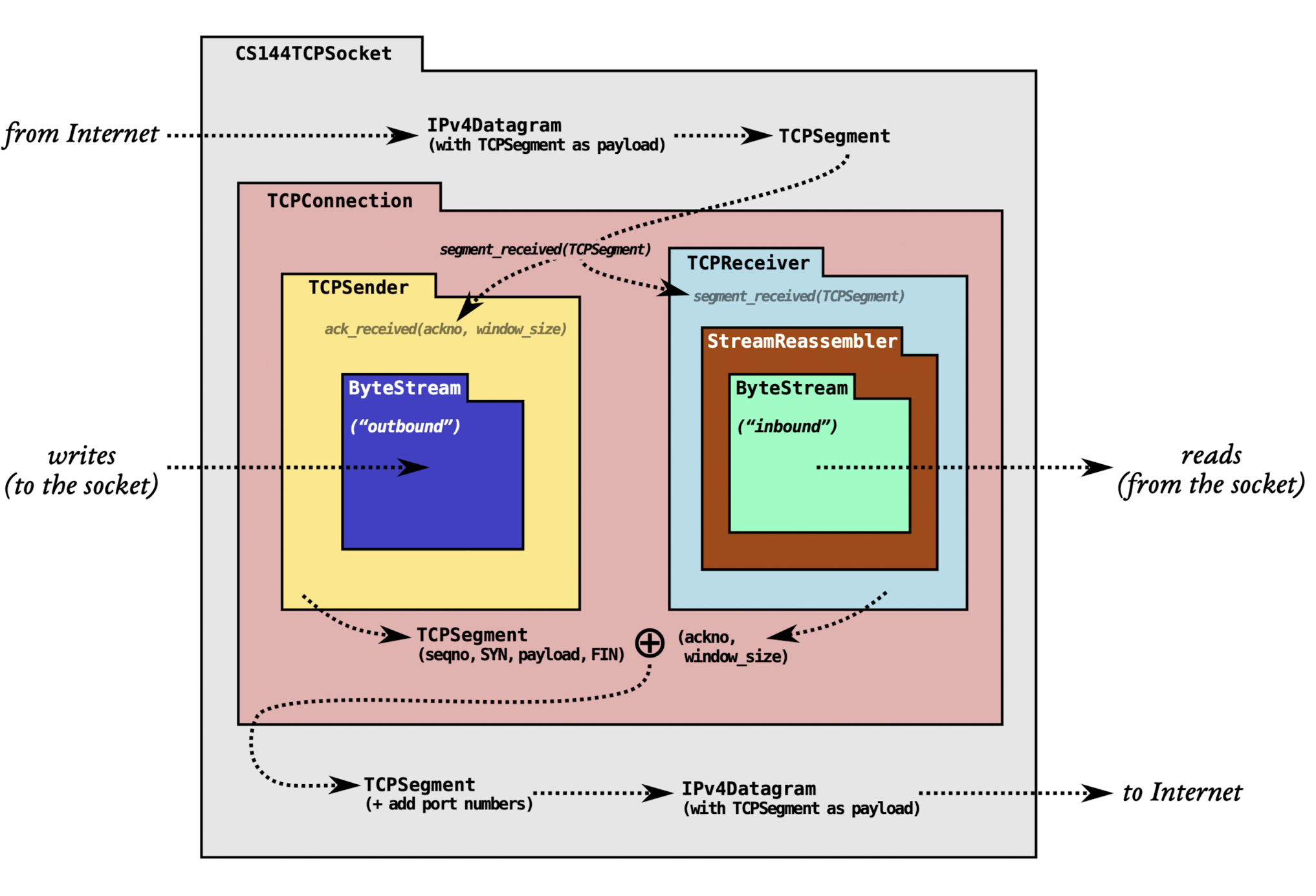 Lab0 体验了操作系统自带的socket的使用。接下来 Lab1 ~ Lab4 会逐步实现上图这样的一个CS144TCPSockert (socket不一定是基于TCP,也可以是UDP,所以这个叫TCPSocket),利用不可靠的Network层实现一个可靠的传输流。